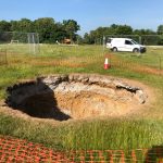 A 3D laser surface survey scan was also required of the locale around the sinkhole. The site was formerly used for making bricks with clay being excavated from a deep bell pit for the manufacturing process. When the site was decommissioned, the area was backfilled with waste. Army sappers were then brought in and covered the site with soil to create a playing field. Seemingly the bell pit had been backfilled until a sinkhole appeared in February 2020.