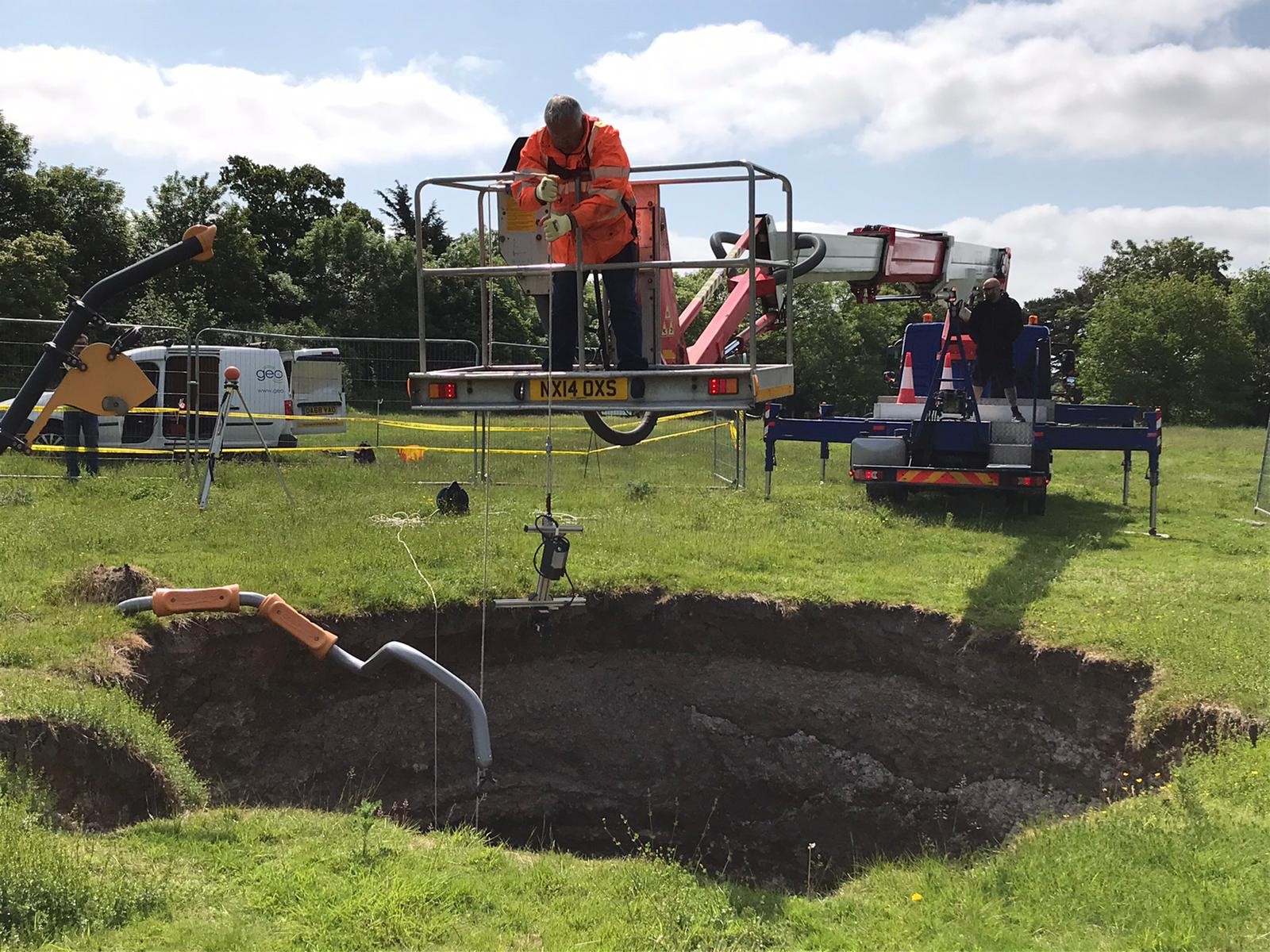 Underground 3D laser scan survey of second sinkhole and bell pit on playing field » 1 – Geoterra – Sappers Field, Wooburn Green – Sinkhole Survey #2 – Photo #1